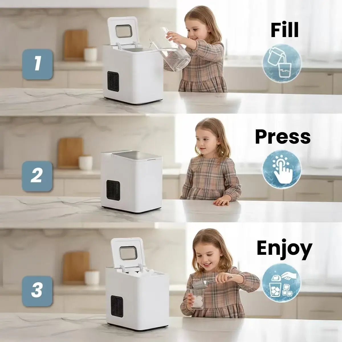 No plumbing. No installation. No confusing buttons. Just fill the tank with water and press start. In 8 minutes you'll have 9 fresh ice cubes ready to scoop. The LED panel tells you when to add water or empty the basket. Done.
